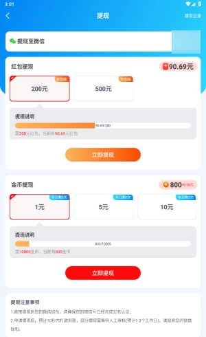 7、提现包含红包提现与金币提现两种类型,二者均需满足特定门槛方可进行提现操作。