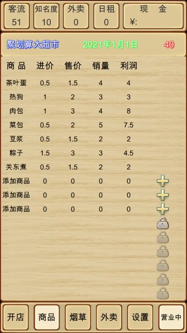 和以往的模拟经营游戏不同,这款游戏没有实体画面,全程都以文字形式呈现。玩家在游戏里可以多看看广告,它的广告增幅效果挺明显的。建议刚开始时每种物品都少量上点,看看流水情况后再有针对性地选品上货;初期也能通过打价格战先积累流量,之后再考虑调整价格。