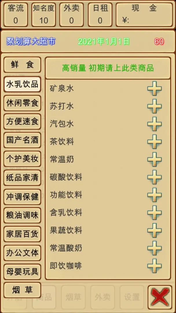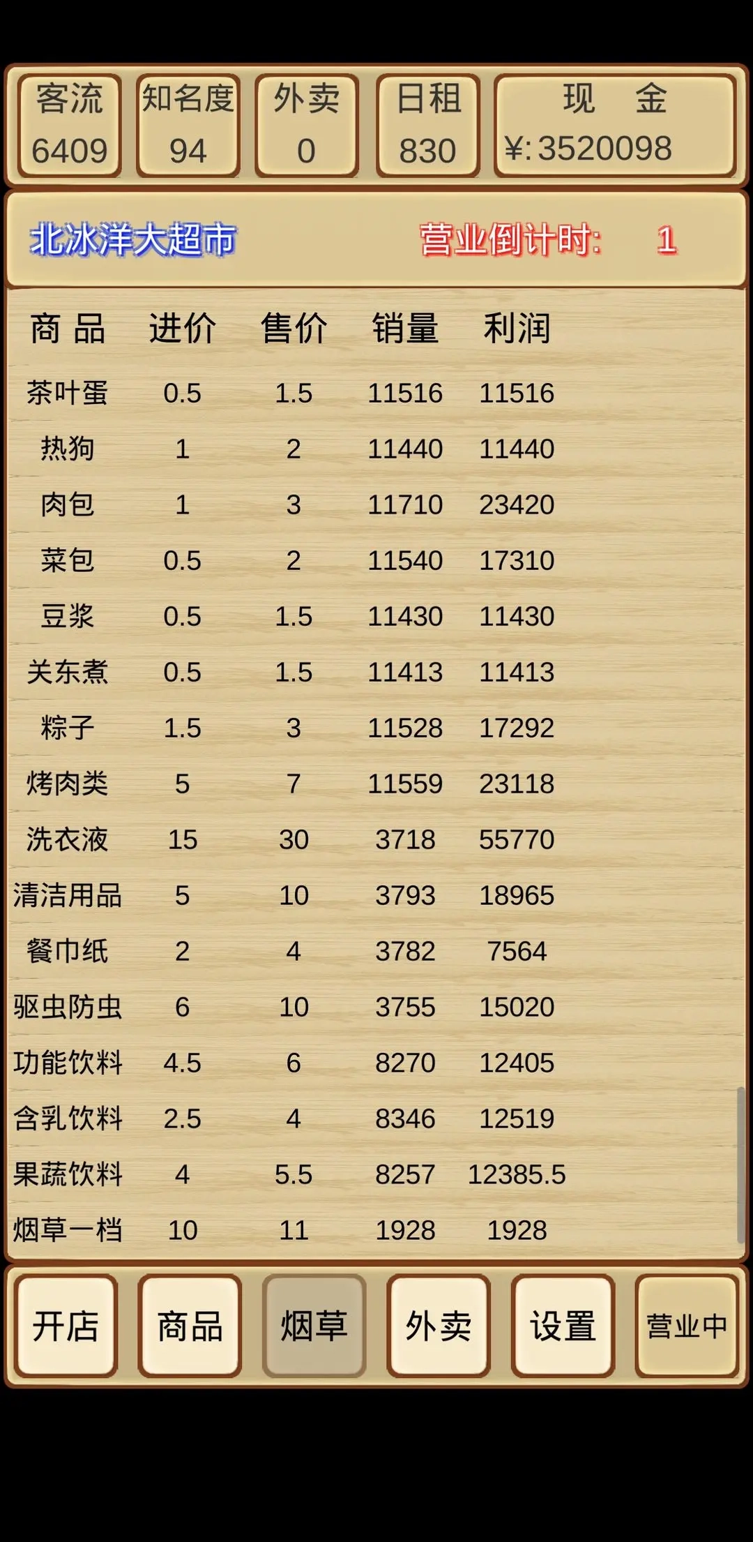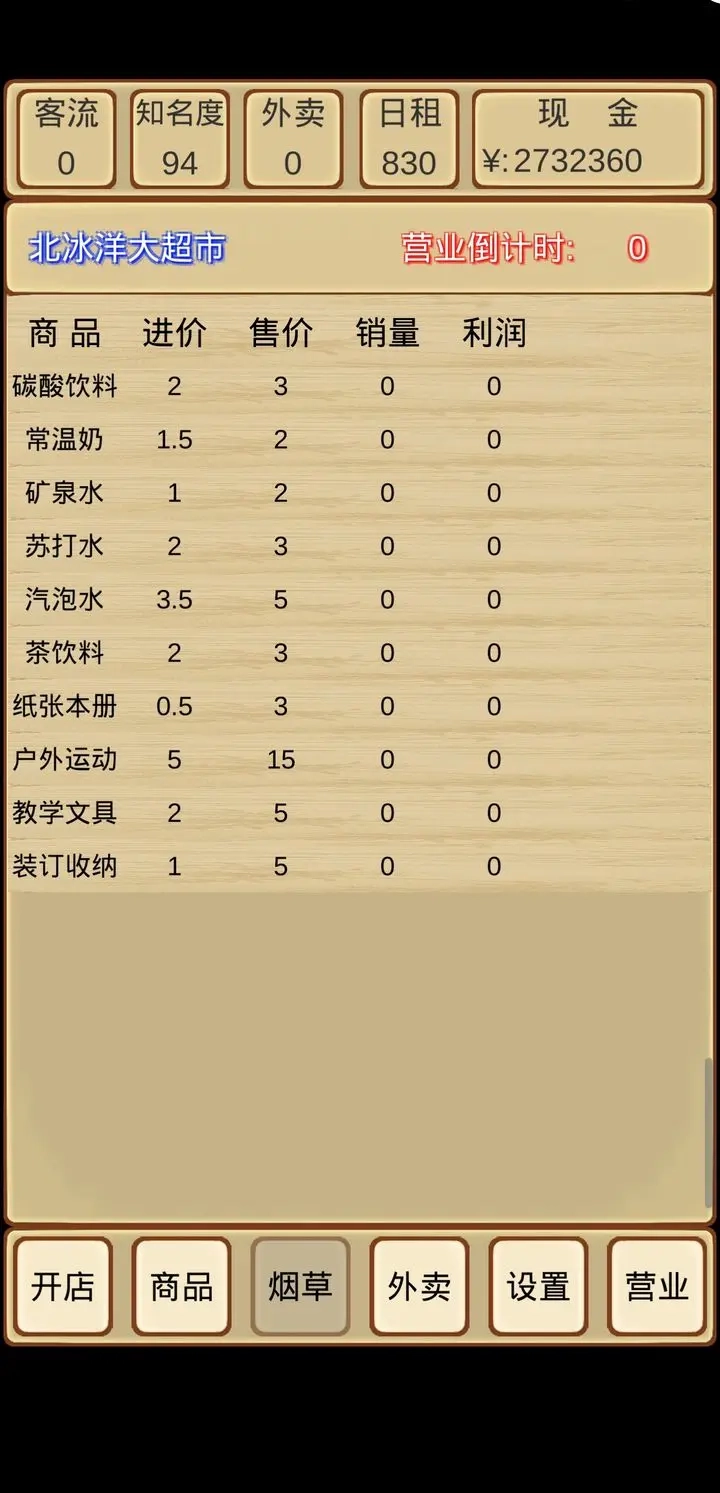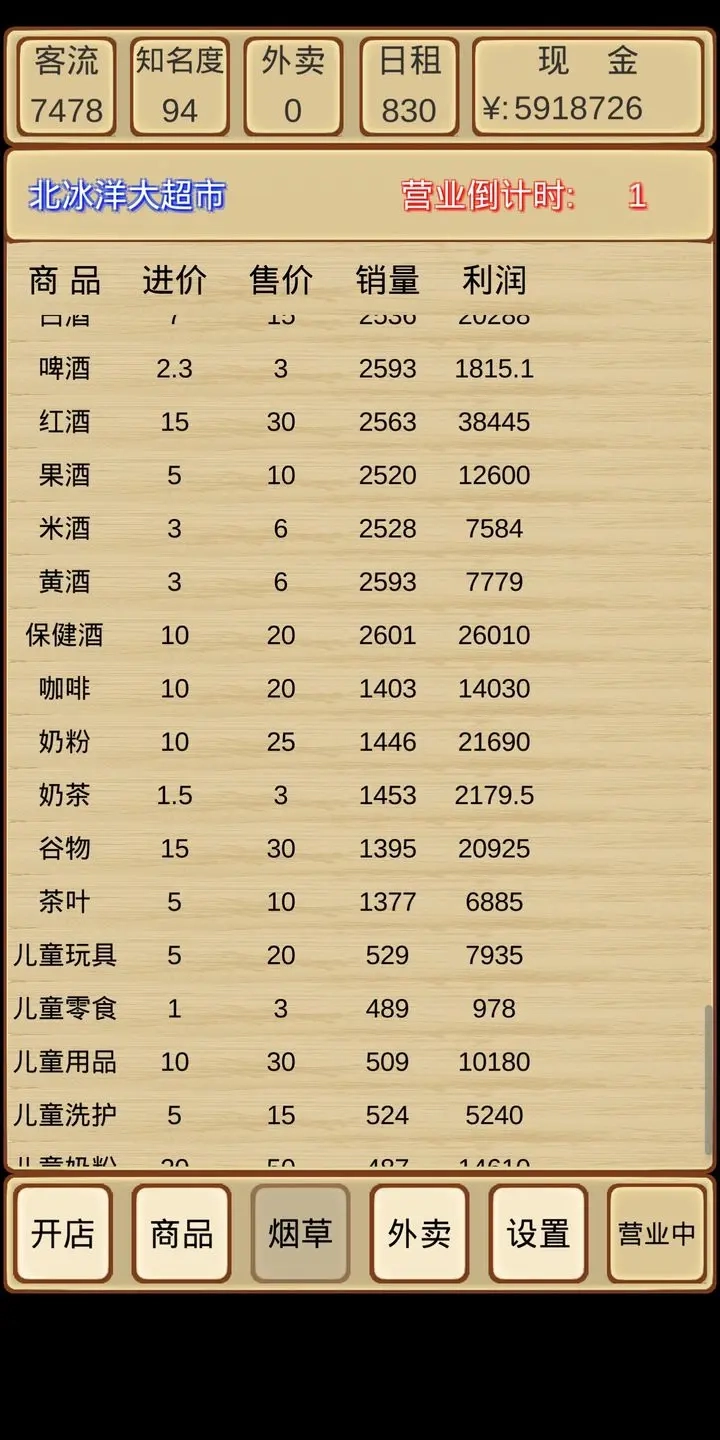 刚开局先把所有鲜食类商品买齐,接着购入全部纸品家清类;之后若想上烟草也可以(不上其实也行,它的利润并没有说的那么高),再之后就上架白酒、红酒、果酒这些酒类商品;然后是除了奶茶之外的所有冲调保健类,接下来是除了儿童零食以外的所有母婴玩具类;再然后是除了香皂和牙膏牙刷之外的所有个户美妆类,之后是除了盐、糖、鸡精以及面条面粉以外的所有粮油调味类;接着上架家居百货里的电池、排插、厨房用品和家居用品,再然后是办公文体中的户外运动类和方便速食里的自热系列;之后就可以挂机等着攒钱,随便上架商品,等位置扩充完就通关了。这套流程下来一两个小时就能通关,我用的时间大概也就一个小时左右(当然是一直点操作)。