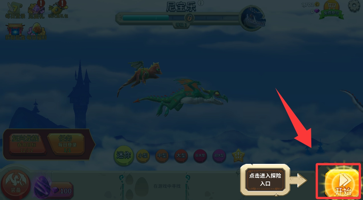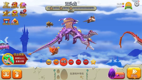 2、进入领土探索界面后,就能按照任务要求挑选龙、皮肤和宠物,可参与的龙的尺寸包括:“迷你”“小”“中”“大”“巨大”“超大”