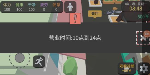 7、拉完后回到商业街,找到长椅睡10个小时,接着去吃饭(同样两样各一份),花费34元后剩余712元。之后先打工,再吃饭,再打工可收入246元;如果看一次广告就能有1046元,这样就可以租房了(不想看广告的话就重复上述流程)