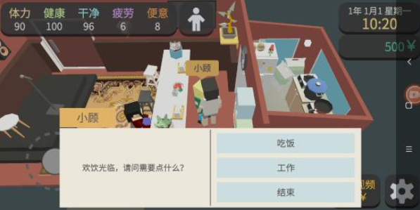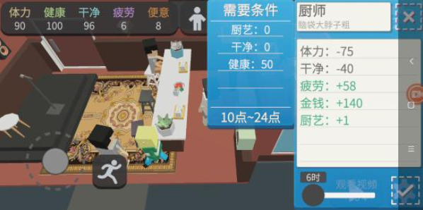5、结束工作后点击吃饭选项,这里有两道菜,每道菜都要吃一次(不用节省),吃完饭后再进行一次工作(按照这样一套流程操作下来,就能赚到246块钱,这是我目前——也就是前期——发现的赚钱速度最快的办法),这样算下来现在通常就有746块钱了!你可以看一次广告(建议看一次就足够了)