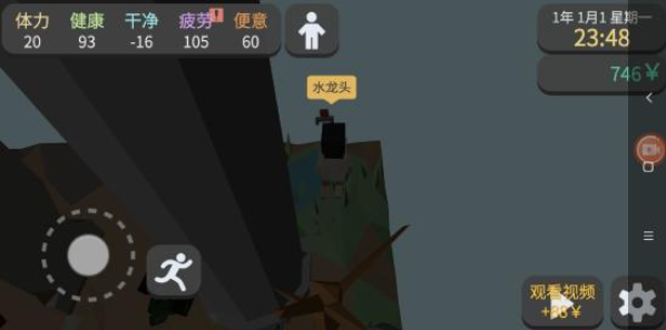 6、接着回到出生点,右侧会出现一个水龙头,在这里洗个澡,把所有体力都用在洗澡上。此时疲劳值和便意值通常也快满了,我们走到出生点的位置,就能解决方便的需求了。