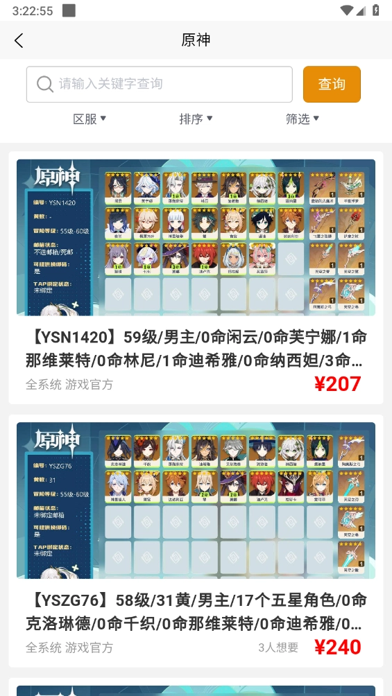 4、例如选择进入原神时,能够依据区服、排序来开展筛选操作。