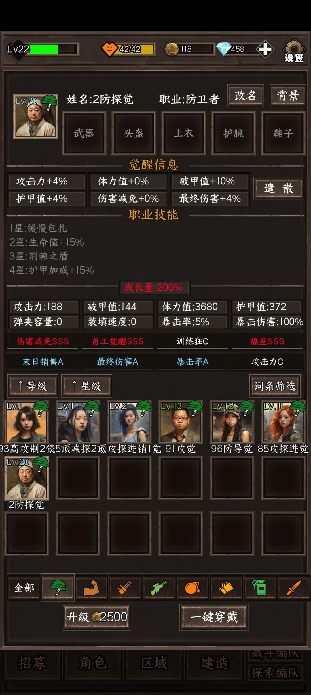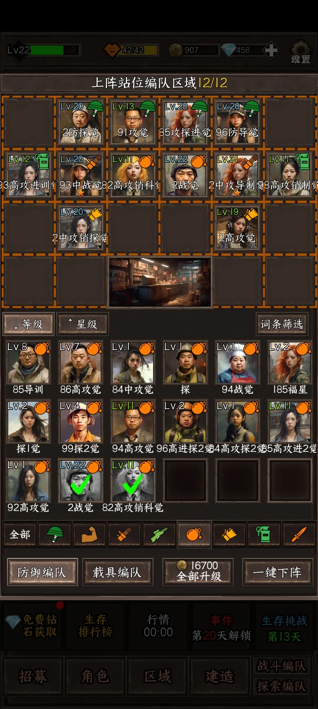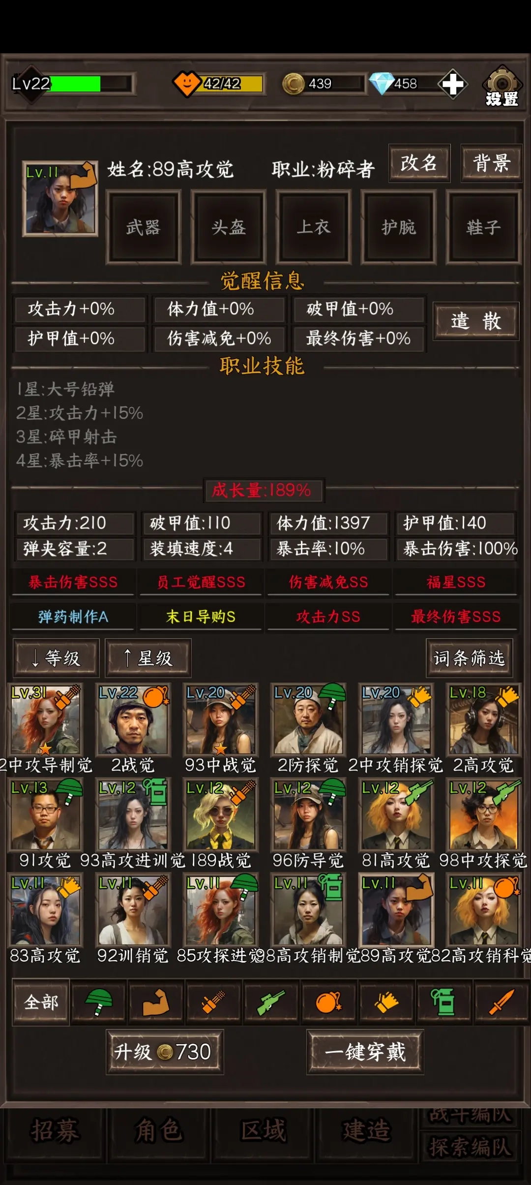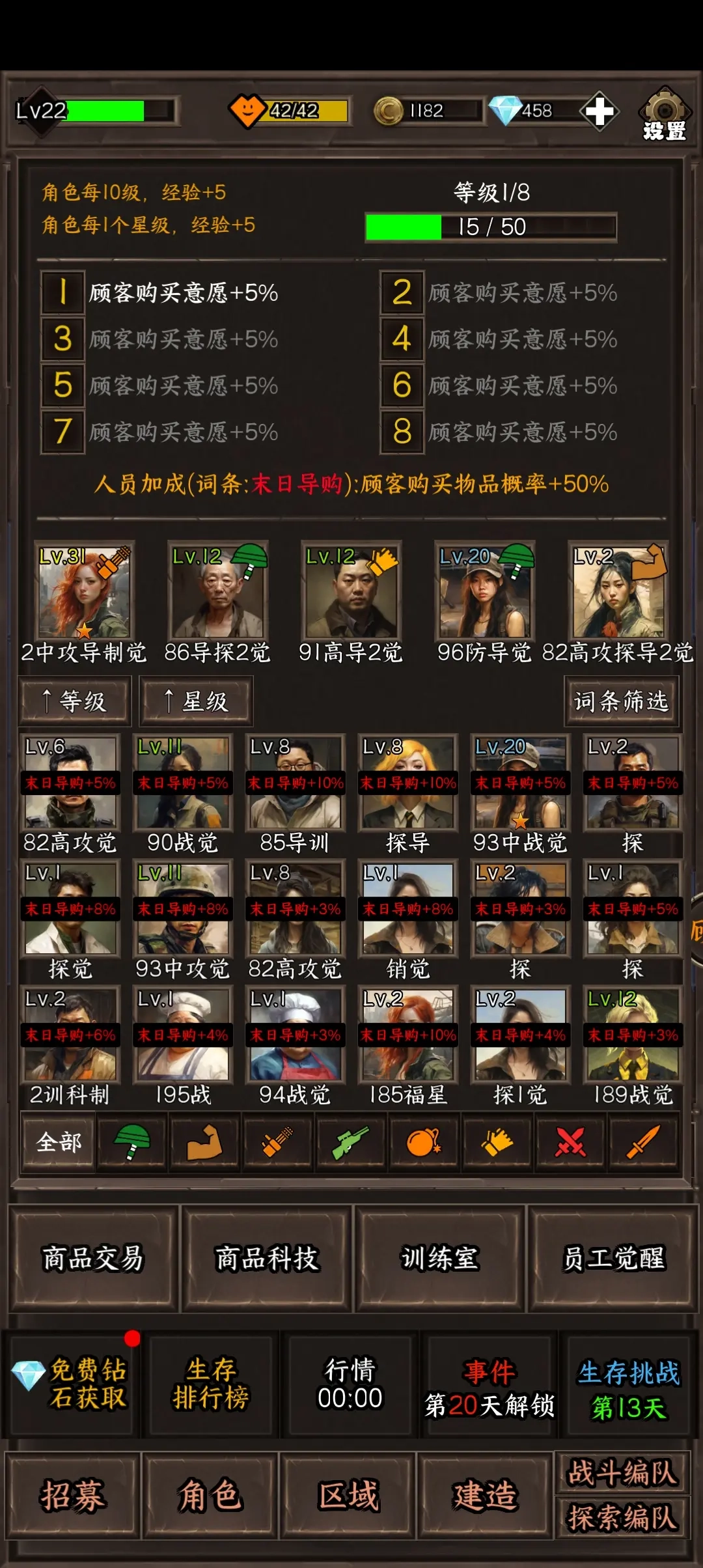 阵容组合推荐:4名防御型角色搭配2名输出、2名干扰、2名投掷者与2名支援者,干扰和投掷者位置可替换为输出角色,但支援者需保留基础配置。资源充足时可组建两支队伍,资源有限则集中培养一队;若关卡难以通过,可先探索区域补充资源,当危险值达到100%时使用载具队攻坚。销售、导购、进货、科研、训练这五个职业的词条,每个都需凑齐5个,以此提升角色的星级与等级,获取职业经验并解锁额外属性加成。
