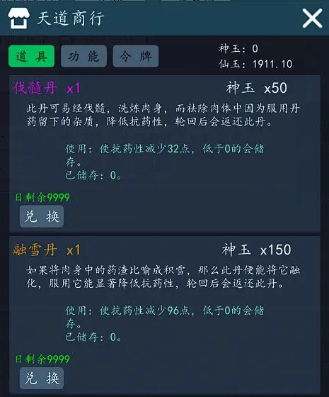 2. 天道丹(天道)。这是游戏里最核心的资源,游戏中的天道资源分为两类:一类是限制线以下使用的,包括天道感悟和天道补缺丹;另一类是限制线以上使用的天道凝丹,其品质对应的时长为绿品一年、蓝品三年、紫品五年。天道资源可用于功法提升、顿悟以及鲸吞功能的使用。