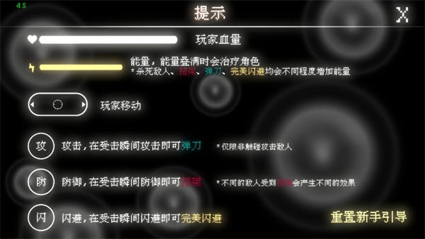 查看提示信息:玩家的血量与能量状态。当能量值充满时,可对角色进行治疗;而击杀敌人、成功招架、触发弹刀或完成完美闪避等操作,都能提升能量值。