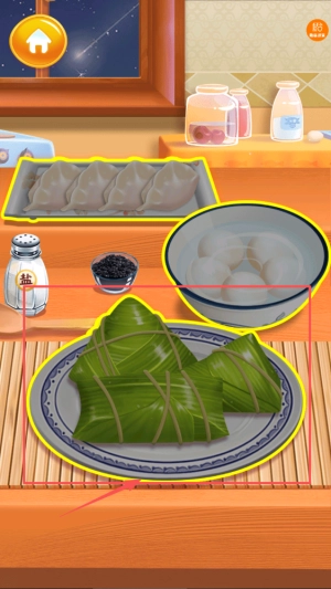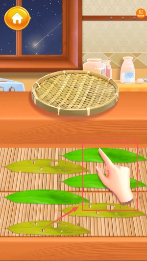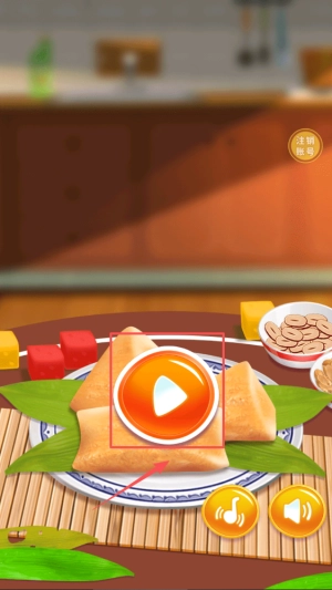 2、请留意食材区域,挑选所需的糯米、粽叶等材料,将它们拖拽至竹席或锅中即可。另外,右下角的音效按钮可随时进行开关操作。