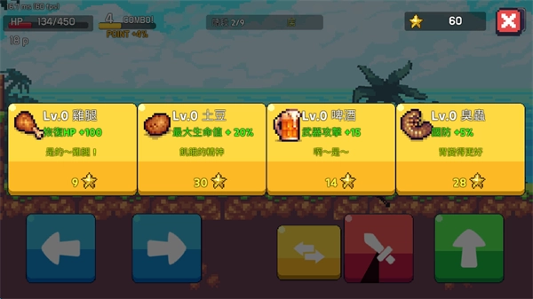 5、击败怪物有概率掉落星星,可购买新武器或道具。