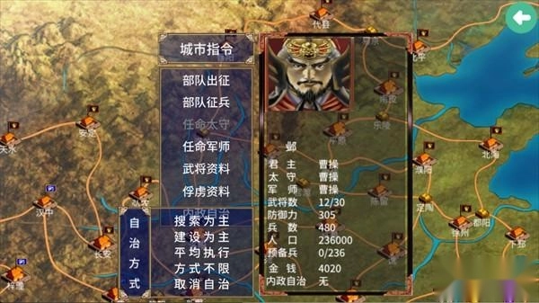 游戏开始阶段,若场上仅君主一人,是无法直接执行搜索指令的。不过玩家可以在大地图里给城市设置内政自治,并将自治方针选定为“搜索”,等到年底进行评议时,启动内政自治机制,再借助S/L大法反复尝试,就有一定概率让系统自动搜索到一名武将。