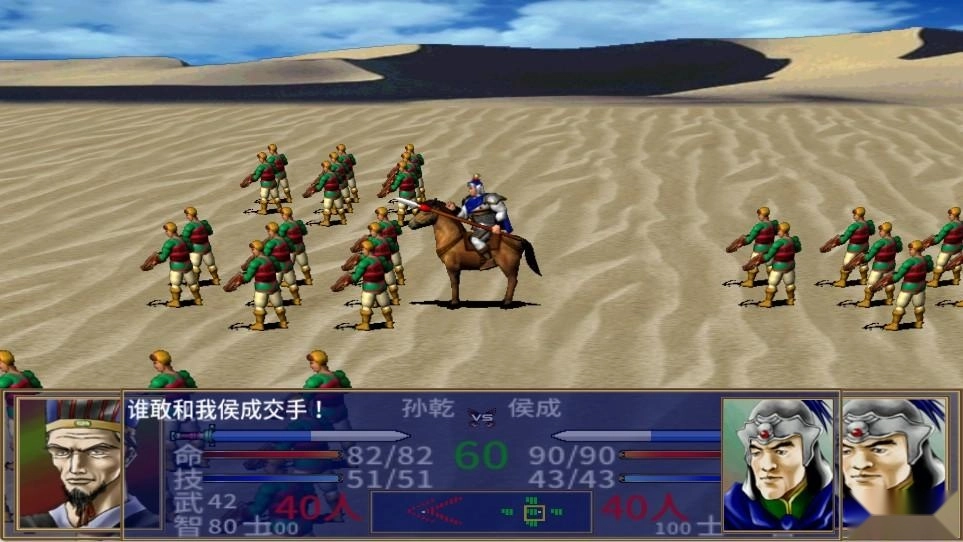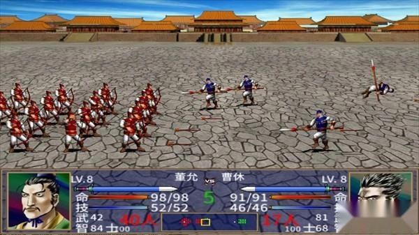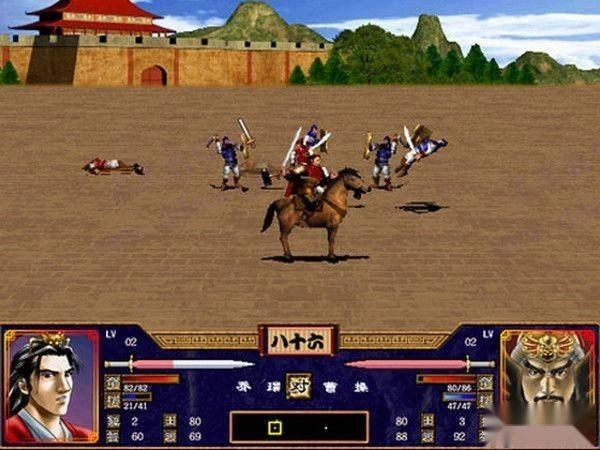 一切准备妥当后,游戏便切换到战场场景。战斗机制与初代基本一致,玩家只需依据游戏内的战斗指令,指挥自己麾下的部队与对手周旋对抗。挑选出战武将时,首先要留意敌方的出战武将,观察其率领的兵种是否会克制我方武将所带的兵种;其次需了解对手的武将技类型,以及其智力和武力的高低;接着再根据敌方所布的阵型,来决定我方将采用的阵型;要善于运用武将技或军师技,因为游戏前期武将的能力普遍不强,而后期的敌人又相对厉害,所以这些技能可是获胜的关键。当然,如果战况对我方不利,也需要考虑撤退以保存战斗力,之后再找机会和其他部队会合,继续与对手周旋,从而取得最终的胜利。