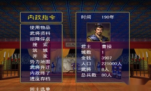 每年一月开启内政经营阶段,玩家占据的所有城市都会产生税收收入。这一阶段中,玩家可下达搜索、内政开发等内政类指令,每位武将在该阶段仅能执行一次内政指令。若武将处于出征途中,或在内政阶段未进入城市,则无法执行内政指令。