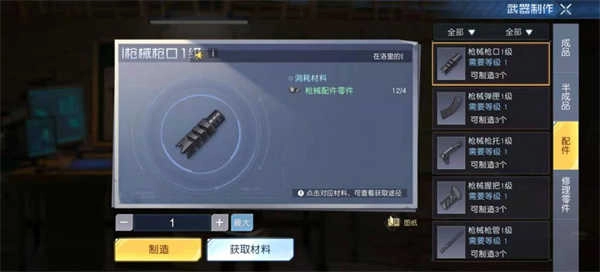 要获取武器配件,得用到庄园里的武器制作台,玩家进入武器制作界面后,找到配件分类即可进行相关操作。当前版本中,制作配件所需的所有材料都能在商店直接买到,玩家只需花费少量银币就能完成购买。综合来看,武器配件的获取难度是比较低的。