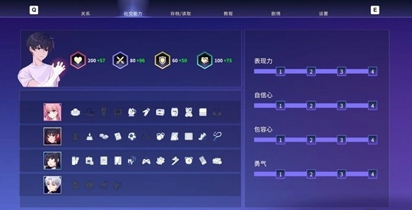 游戏内设有表现力、包容心、自信与勇气这四项社交属性,它们会对好感事件的触发产生影响。