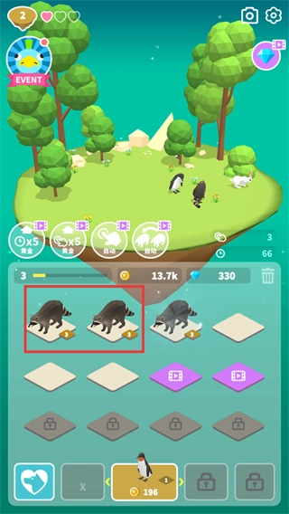 1、在游戏场景里把【浣熊】进行合并,通过升级动物来提高收益,逐步积累资源以开启更多玩法。