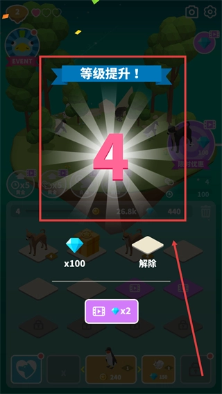 4、当等级提升至【4】级时,将解锁全新区域,获取钻石奖励,并解除位置锁定以拓展动物的放置空间。