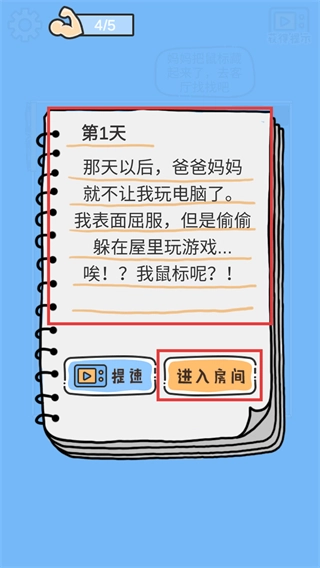 1、按照日记里提到鼠标不见了的提示,点击【进入房间】按钮开启寻找,这是游戏的初始操作步骤。