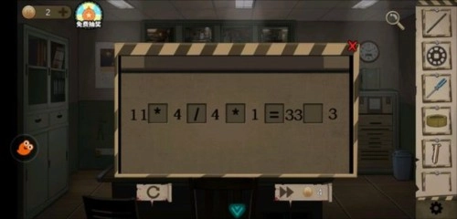 人偶手臂所指的方向提示我们,需将右侧墙壁上的大钟指针调整至3点35分,完成后可获得半把钥匙。接着点击右侧墙角处时钟下方的柜子,会出现一道算式题。请从最左边的方框开始,在五个方框中按顺序填入运算符“*、/、*、=、/”,确保等号两侧的数字能够相等。