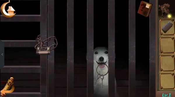 用哨声唤醒狗狗,拿骨头把它引过来,拿到钥匙后,打开门就能逃出去了。