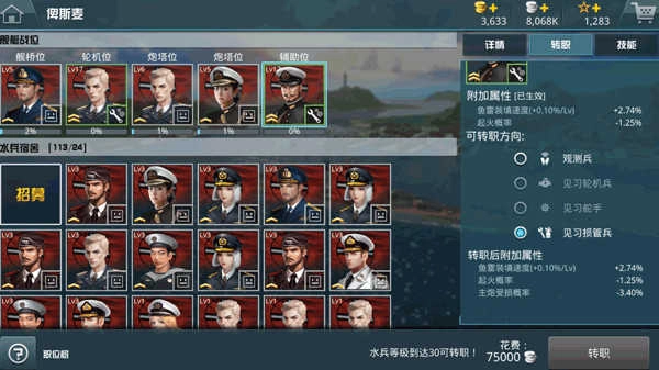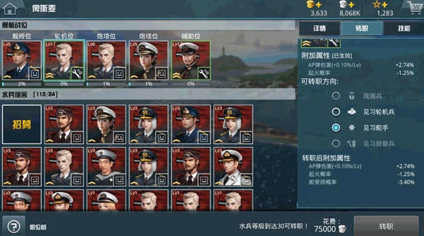 既然聊到转职,这一操作能让乘员的实力得到显著提升,其带来的额外被动属性加成同样不容小觑。不同的转职方向对应着不同的附加能力属性,像见习舵手这一方向,就能赋予舰船降低受损概率等提升生存能力的技能,此外还能减少起火几率、增强AP弹伤害等关键增益效果。