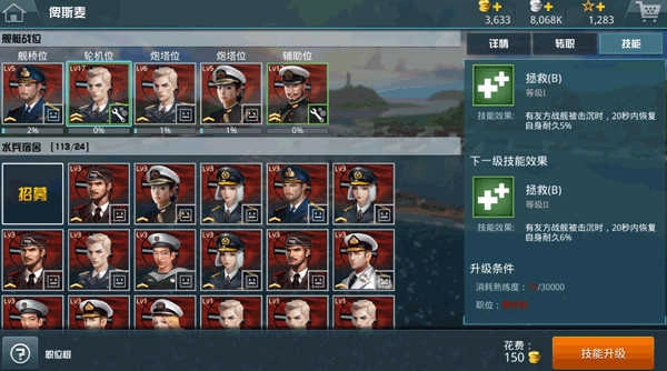2、除了上述加成外,部分水兵还具备特殊技能,例如“拯救”技能——当我方舰船被敌方击沉时,该技能可通过营救落水的友方水兵,为自身带来少量的血量提升。