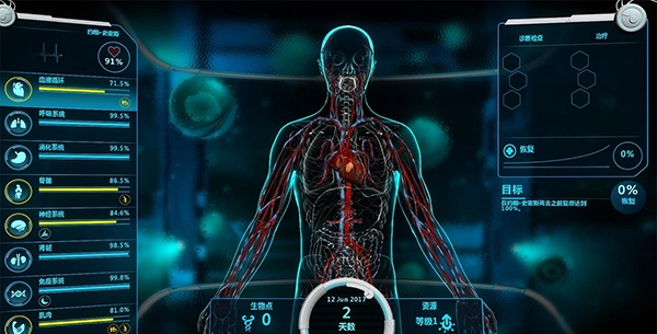 接到病人后,我会告知当前关卡的目标,只要达成目标就能通关。这类告知信息里往往包含一些相关内容,像从下图中就能了解到病人的疾病主要集中在血液循环和神经系统,等下诊断时就可以针对这两个系统采取相应措施。不过,出于医者仁心的理念,我也会尽力治好病人的其他疾病。好了,实习医生准备就位!