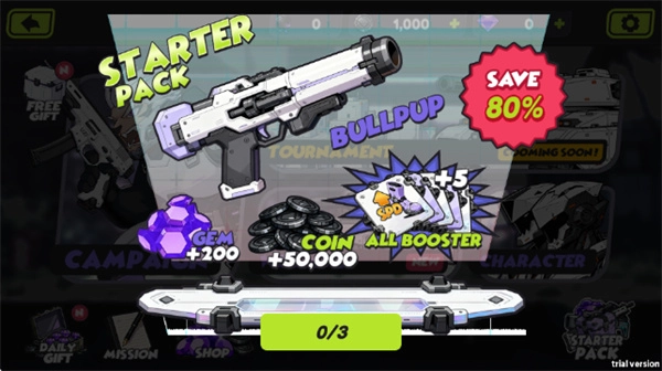 2、进入主界面后你可以看到战役、武器和商店等功能入口同时还能查看每日奖励和任务,如果想让前期更轻松也可以选择购买新手包获得初始武器和货币。
