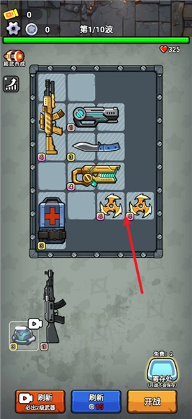 3、接着把目标武器相互叠加就能得到超武,比如这里飞镖和小刀合成就做出了骷髅电锯!