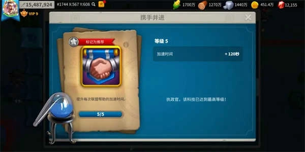 携手共进:提升联盟援助的最短加速时长,当该技能升至满级后,联盟单次援助的最短时间将变为3分钟。在游戏前期,各类升级所需时间普遍较短,不少时候只要援助次数用完,建筑或科技就能完成升级,这能显著加快联盟成员的发展进度。