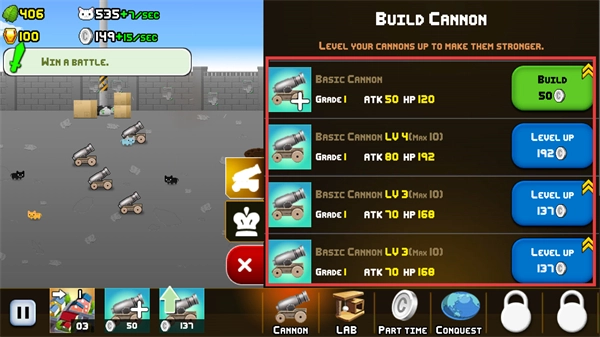 2、通过【BUILDCANNON】界面升级【BasicCannon】,提升攻击力与生命值,增强战斗输出能力。