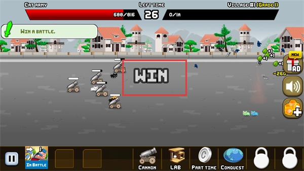 4、击败敌方后显示【WIN】,可获得资源奖励,助力后续炮台升级与新战斗准备。