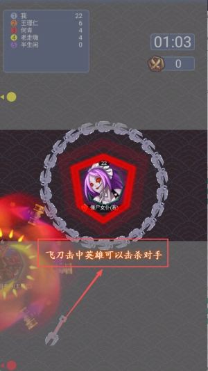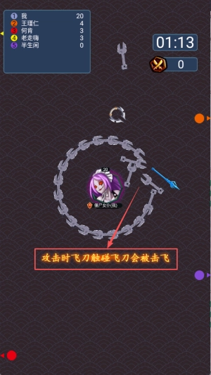 3、攻击敌人:攻击过程中,若己方飞刀与敌方飞刀发生触碰,会被对方飞刀击飞;只有当飞刀直接命中敌方英雄时,才能将其击杀。