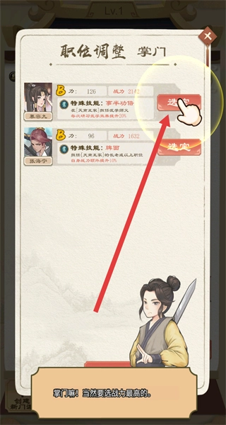 4、在职位调整掌门界面,选择战力最高的角色,点击选定按钮,完成掌门职位的任命,提升门派运营效率。