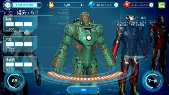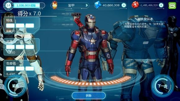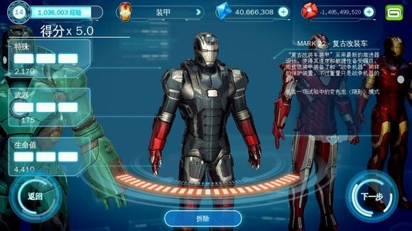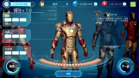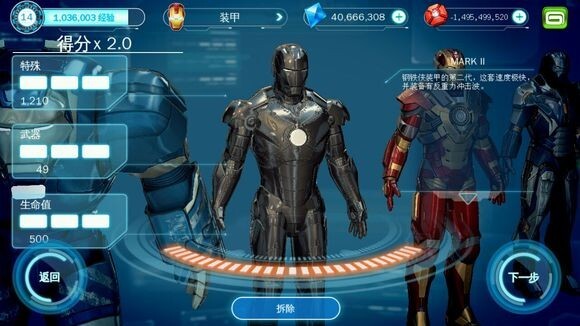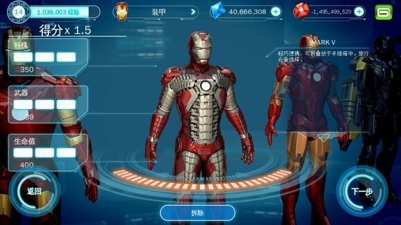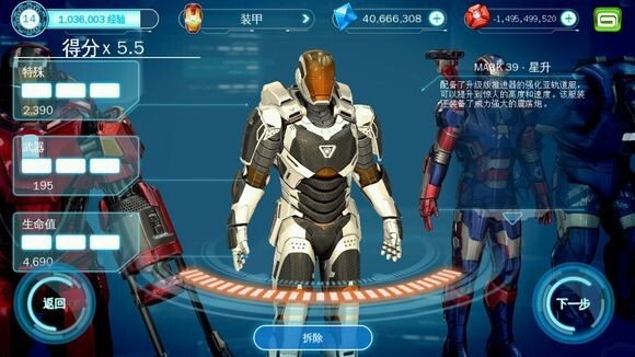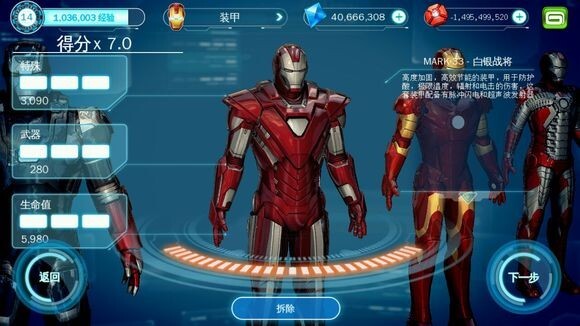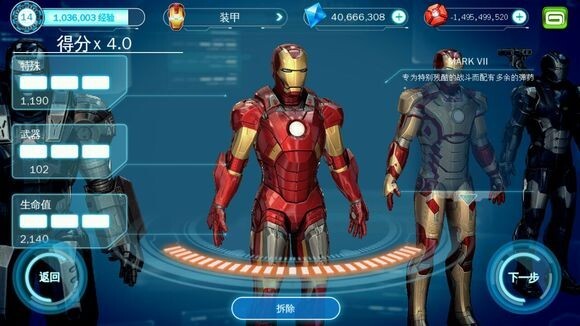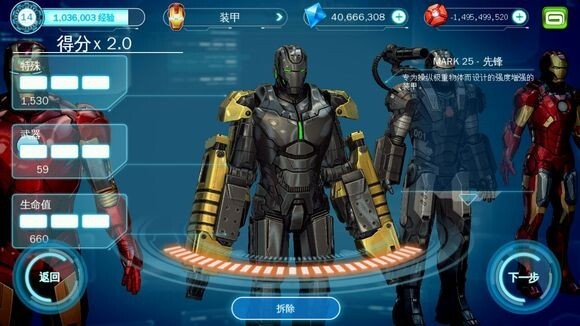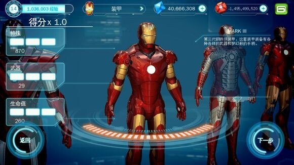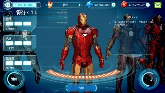 2、在游戏里,玩家能够借助战斗获取经验值,提升钢铁侠这一角色的等级,进而解锁更多的钢铁战衣。