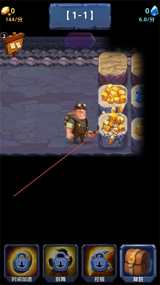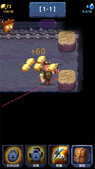 4、矿工使用挖掘技能后,每次开采矿石都能额外获得60金币,通过持续积累这些资源来推进关卡进度。