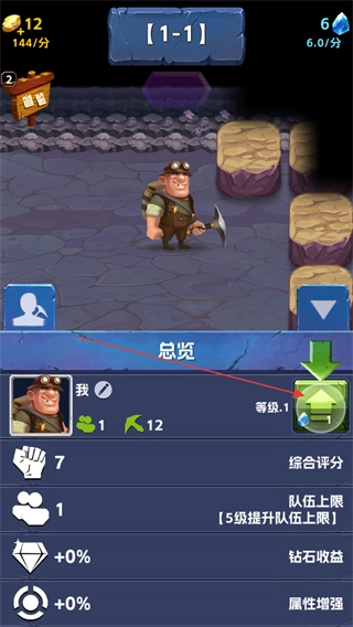 2、进入总览界面后,使用钻石来提升角色等级,以此增强与开采相关的各项属性。