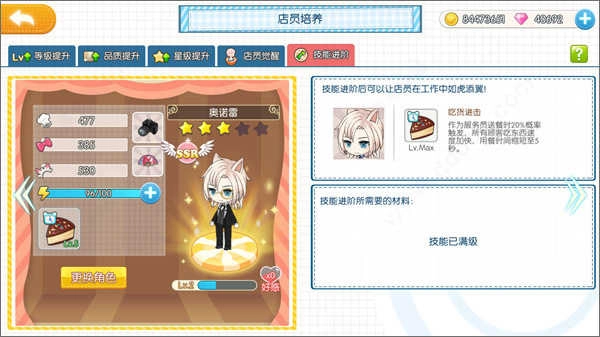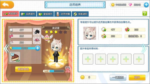等级提升:店员升级既可以使用经验书,也可以通过“吃掉”其他店员来实现(这喵星人世界也太残酷了吧)……材料选择方面,店长既可以手动挑选,也能交给系统一键添加。这里要特别说明的是,一键添加时只会自动选中珍贵度在R以下的路人店员,也就是N级店员,所以各位店长完全不用担心自己心仪的小哥哥被误当成升级材料“吃掉”哦~(什么?你说你偏偏喜欢N级店员?那……emmm……)