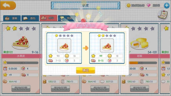 甜品可通过升级、完成任务等途径解锁新品,料理等级最高能提升至5星级,升星后会增加各类属性;制作甜品需消耗对应的食材和店员体力值,而研发升级则要消耗体力值。