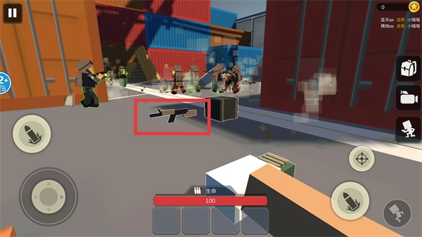 3、在场景里拾取【红框内】的枪械道具,以此获取武器装备,为接下来的战斗做好准备。