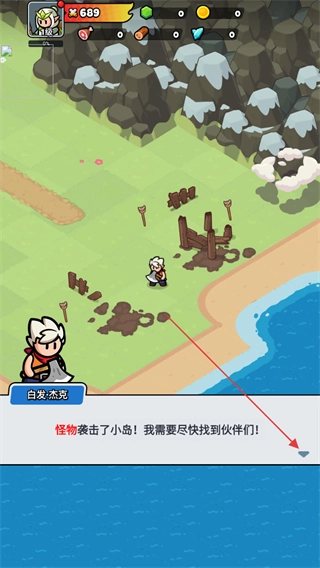 1、进入这个场景后,按照白发·杰克的指引,知晓怪物袭击小岛的状况,点击界面上的箭头按钮推动剧情发展,为去寻找伙伴做准备。