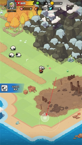 接取击杀3只绵羊的任务后,通过底部的操作轮盘来控制角色移动,靠近场景里的绵羊,为完成任务做好战斗准备。