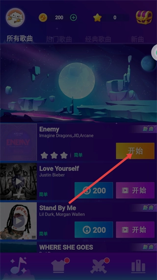 1、在歌曲选择界面,找到《Enemy》对应的“开始”按钮并点击,即可进入该歌曲的游戏准备界面。