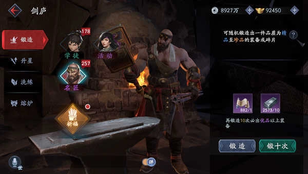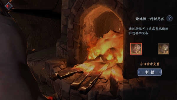 玩家通过消耗锻造材料来获取装备。锻造分为“学徒锻造”和“名匠锻造”两种选择,名匠锻造产出精品到珍品品质装备或碎片的概率比学徒锻造更高。在进行锻造前,玩家每天拥有一次免费祈福的机会,通过消耗三种不同类型的祈愿签,能够获得锻造装备时的优势状态加成。