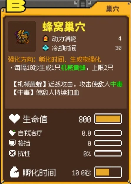 这里放置召唤物的顺序也是有讲究的,和魔兽的机制有点类似——得优先选那些召唤速度快、召唤物能迅速打出伤害的巢穴。毕竟开局时打矿的伤害会转化成动力,这样才能拿到天胡开局。所以我通常会先放兔子(能秒召兔子打矿,快速攒动力),接着放蜂巢(15秒召唤加特林黄蜂,出伤守塔都特别快),再加上乌鸦(打怪生成残魄可以加速输出)。