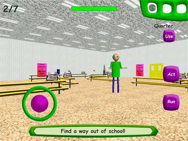 3、在游戏里,我们要帮助巴尔迪一边躲开巴迪,一边收集齐7本笔记本,之后再逃出学校。