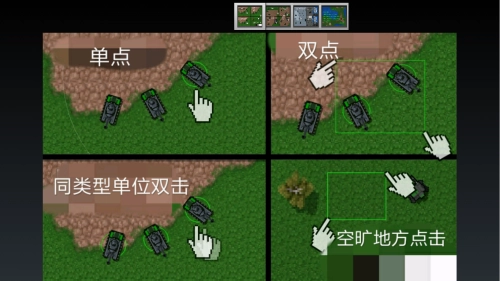 首先简要说明操作方式:点击单个单位即可选中该单位;快速双击某一单位,能选中当前屏幕视线范围内所有同类单位;持续按住屏幕任意一点,会以该点为圆心,半径持续扩大,从而实现大范围选取单位;同时点击屏幕上的两个点,则会在两点之间形成矩形区域,对区域内的单位进行框选。