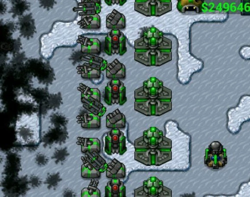 防御塔-炮塔:造价500元,仅能攻击一定范围内的地面目标。额外花费600元可升级至2级(满级)。该防御塔性价比极高,既可用作基地防守,也能在抢夺资源时充当守卫,还能部署在关键路径上阻滞敌人推进。其建造成本低廉,单体作战能力强劲,由于AI通常只会发起小规模攻击,多建造几座便能有效压制AI。