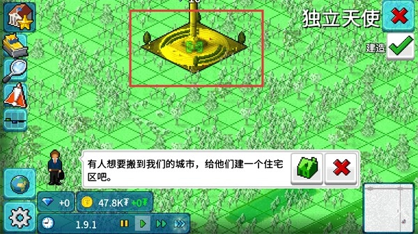 4、点击界面右上角的确认按钮完成【独立天使】的建造,同时可处理下方居民住宅的建造提示来完善城市。
