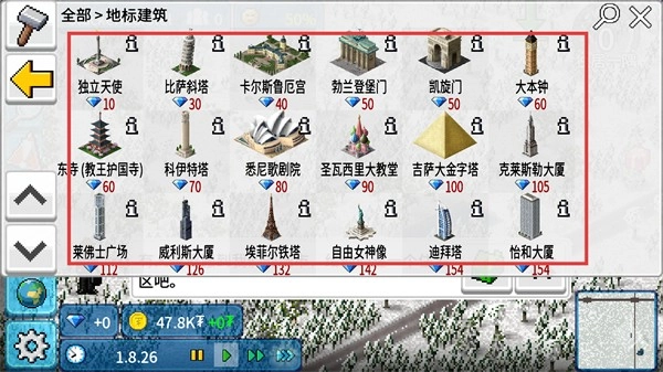 1、进入功能菜单后找到并点击【地标建筑】选项,开启地标类建筑的选择界面,为城市增添特色建筑做准备。