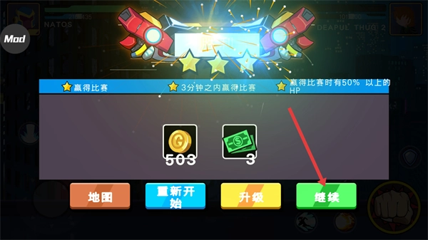 4、击败敌人后会弹出结算界面,在该界面可查看“503金币 - 3钞票”的奖励,点击“继续”按钮即可推进至后续关卡。